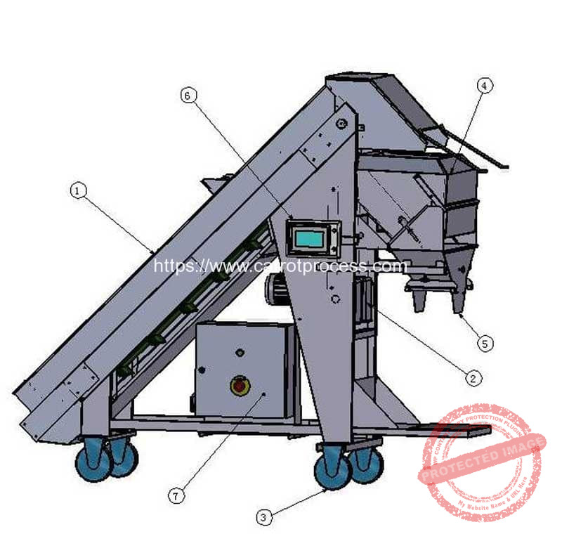 1.PVC conveyor system 2. Drives of conveyor 3. Chassis 4. Hopper with tensometer 5. Exchangeable sack fillers